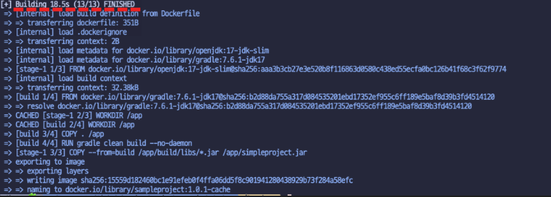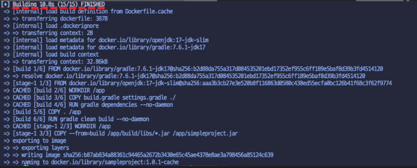 기존의 Dockerfile과의 차이점은 build.gradle과 settings.gradle 파일을 복사한 뒤, gradle dependencies 명령어를 수행하는 부분이 추가되었다.