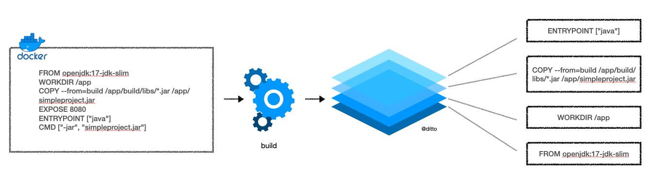 그리고 빌드된 이미지의 각 레이어는 도커 엔진의 캐시에 물리적인 파일로 저장된다. 저장된 캐시 레이어를 이용하면 리소스를 효율적으로 사용하고, 이미지를 더 빠르게 빌드할 수 있다.